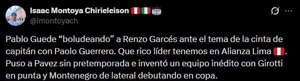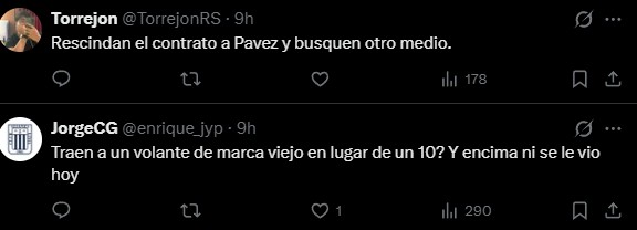 Los fanáticos de Alianza Lima, en tanto, se volcaron a redes sociales para comentar el estreno de Pavez, a quien criticaron duramente por su nivel e incluso apuntaron a las "advertencias" que hicieron hinchas de Colo Colo.