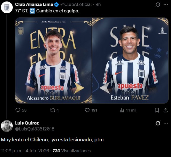 "En su debut con Alianza Lima, y en el primer partido de los blanquiazules por la Copa Libertadores 2026, Esteban Pavez salió lesionado ante 2 de Mayo luego de sufrir un fuerte impacto en la rodilla. Si bien todavía no hay parte médico debido a que todo ha sido muy pronto, el golpe parece ser de gravedad porque el mismo mediocampista chileno salió llorando del campo", agregó.