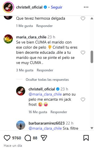 "Se ve bien CUMA el marido con ese color de pelo. 👎 Cristell, tú eres bien decente educada ,dile a tu marido que no se pinte el pelo, se ve muy CUMA", fueron uno de los tantos comentarios atacando al esposo de la cantante.