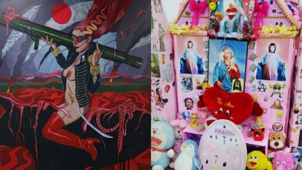 La galería incluía una casa de muñecas rosada con crucifijos intervenidos con Ronald McDonald's, fármacos, penes plásticos, imágenes de la virgen con la cara de Gabriela Mistral y Violeta Parra (entre otros).
