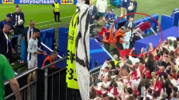 Está grave: El momento en que hincha salta sobre Cristiano Ronaldo pero termina cayendo al vacío El fanático saltó desde las gradas para intentar acercarse al astro portugués tras el partido ante Georgia por la Eurocopa.