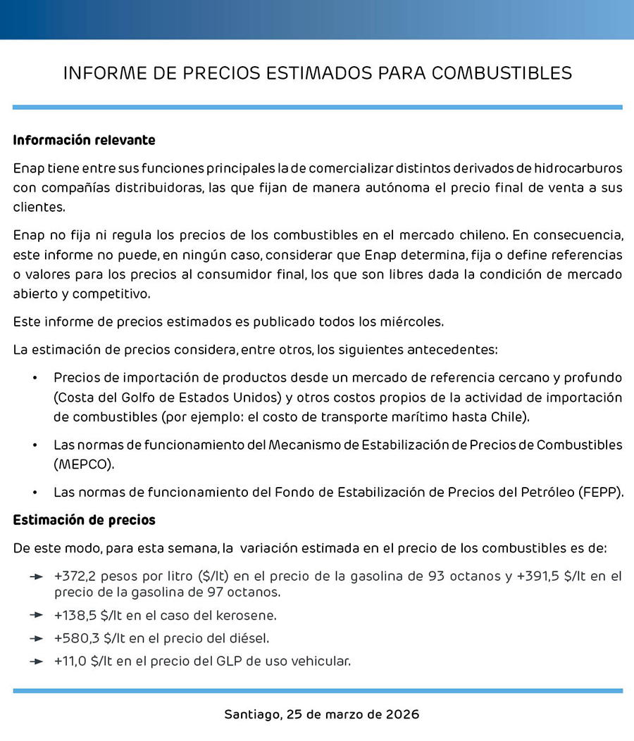 Junto con recordar que la ENAP "no regula ni fija los precios de los combustibles en el mercado chileno", la estatal informa las siguientes modificaciones: