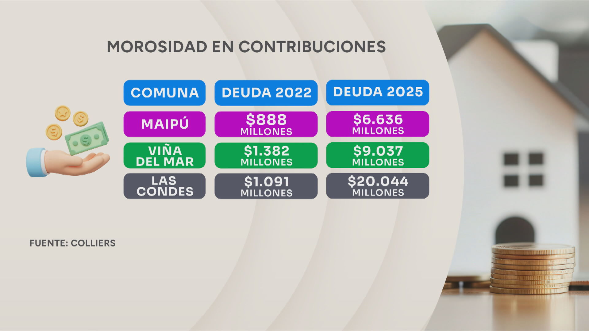 En la región metropolitana, la morosidad creció un 754%, seguida por la región de O'Higgins con un 610% y La Araucanía con un 594%. Por comuna, Maipú lidera la morosidad; pasó de 888 millones a más de $6.636 en el 2025.