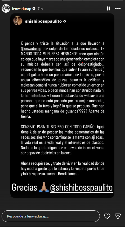 El cantante Pablo Chill-E también se refirió a la situación y le envió su apoyo público, mensaje que fue compartido por Lenwa Dura, quien agradeció las muestras de cariño mientras continúa su recuperación.