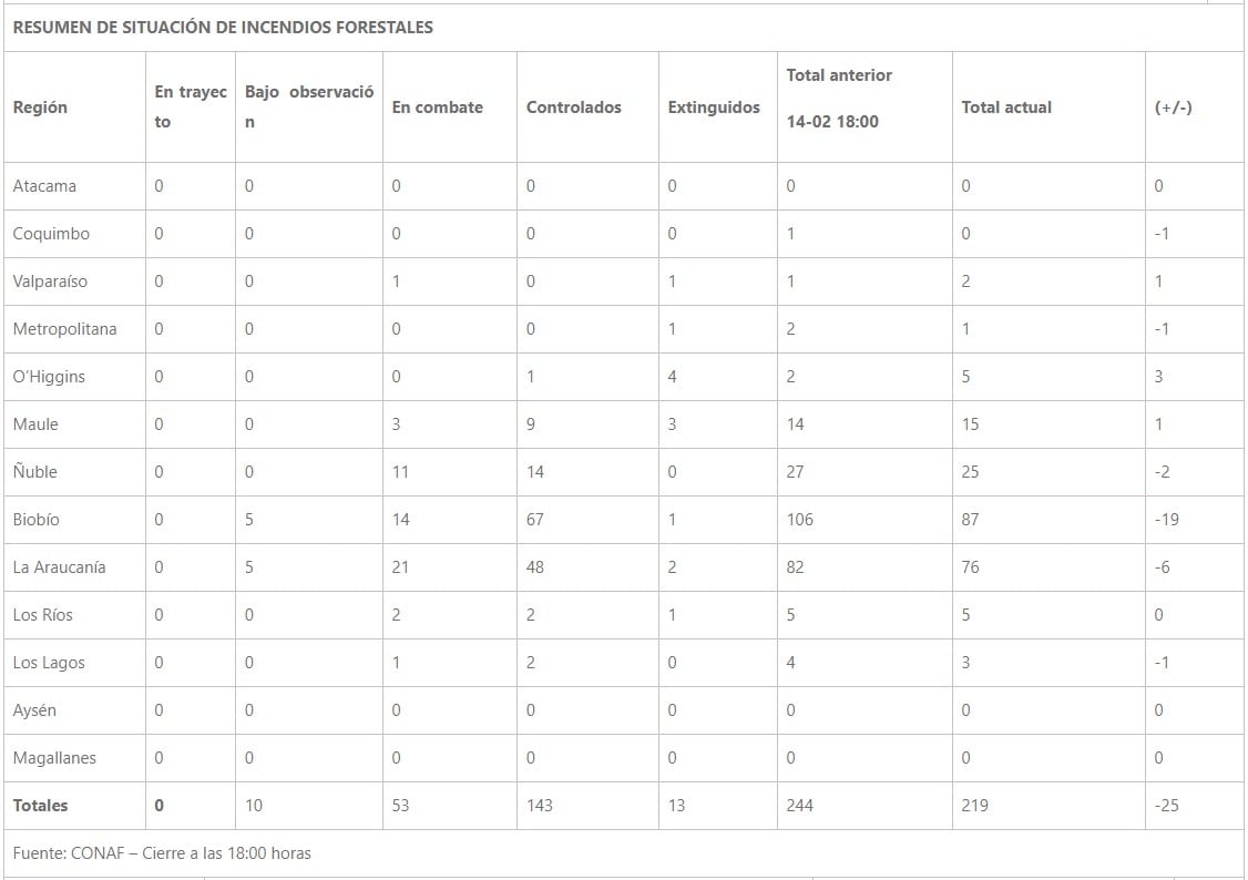 El Servicio Nacional de Prevención y Respuesta ante Desastres (Senapred) entregó el consolidado nacional de incendios forestales durante la jornada de este miércoles.