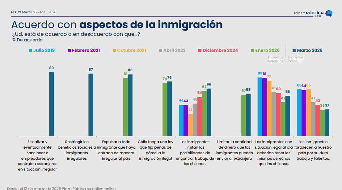 Por último, un 62% (-2pts) estima que la llegada de inmigrantes a territorio nacional es negativa para el país y el 77% (-2pts) considera que debe haber más restricciones migratorias que las actuales.