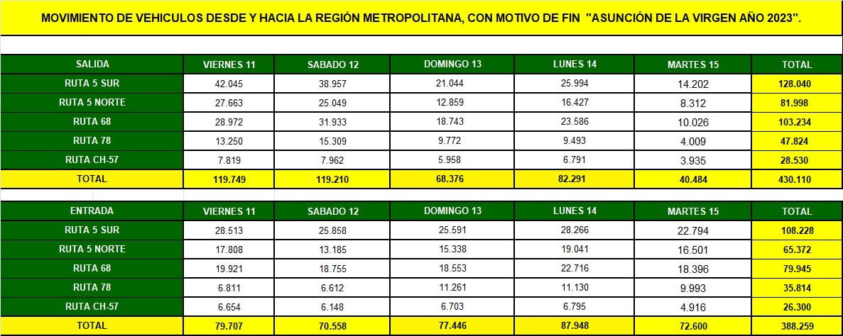 En esa misma línea, indicaron que desde la Ruta 68 han retornado 79.945 automóviles; desde la Ruta 78, 35.814; y desde la Ruta CH-57, han regresado 26.300.