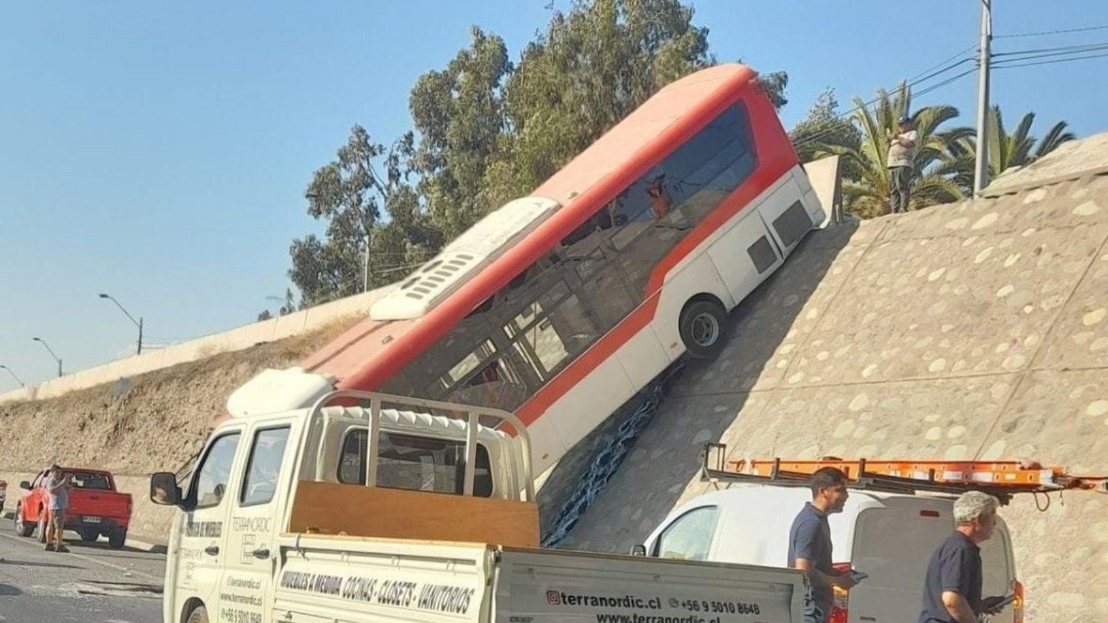 Durante la jornada de este lunes un bus del Transantiago cayó desde la caletera de la autopista autopista acceso Sur de la Ruta del Maipo, hacia la autopista principal en Puente Alto.