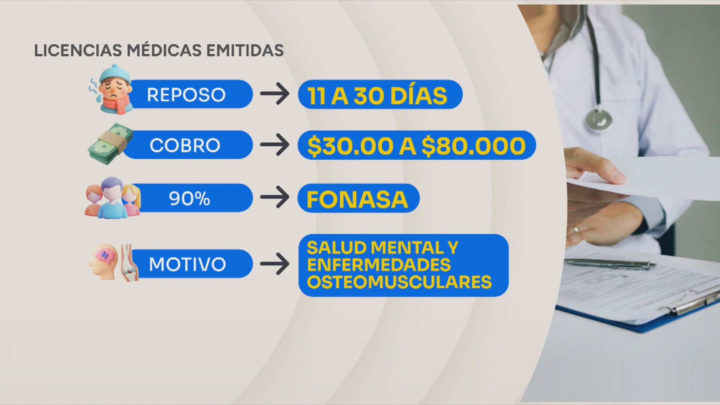 Según la investigación del Ministerio Público, la mayoría de los documentos correspondían a reposos de entre 11 y 30 días, con pagos que iban desde $30 mil hasta $80 mil por cada licencia. Cerca del 90% de los beneficiarios pertenecía a Fonasa, y las causas médicas más utilizadas eran diagnósticos de salud mental y enfermedades osteomusculares.
