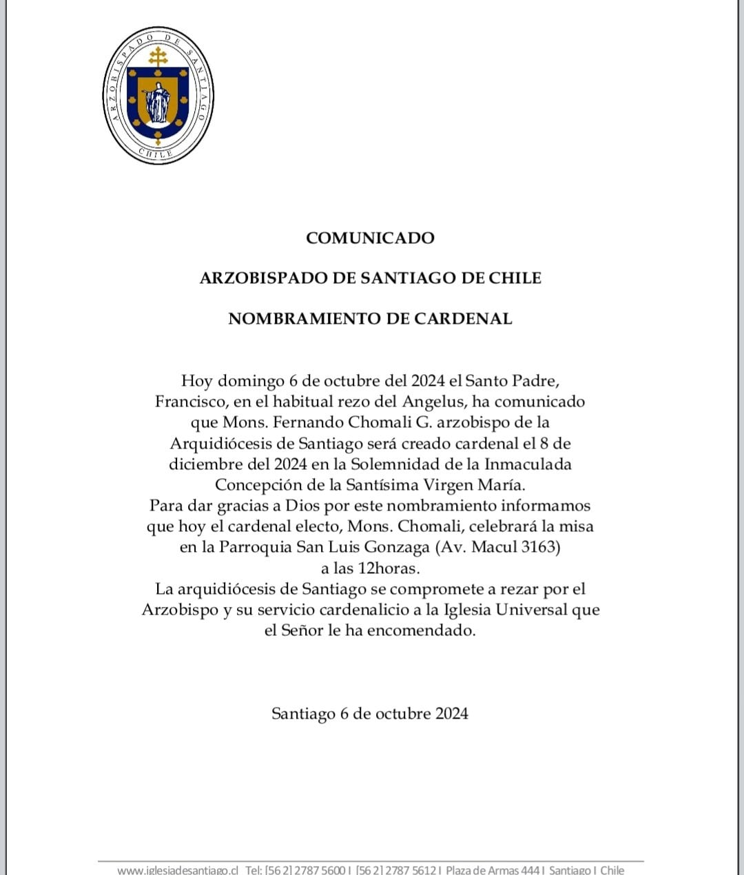 El Santo Padre me nombró Cardenal. Estoy muy emocionado por la responsabilidad y espero ser un aporte para la Iglesia chilena. Recen por mí y yo rezaré por ustedes como siempre lo he hecho. Dios mío, ven en mi auxilio!