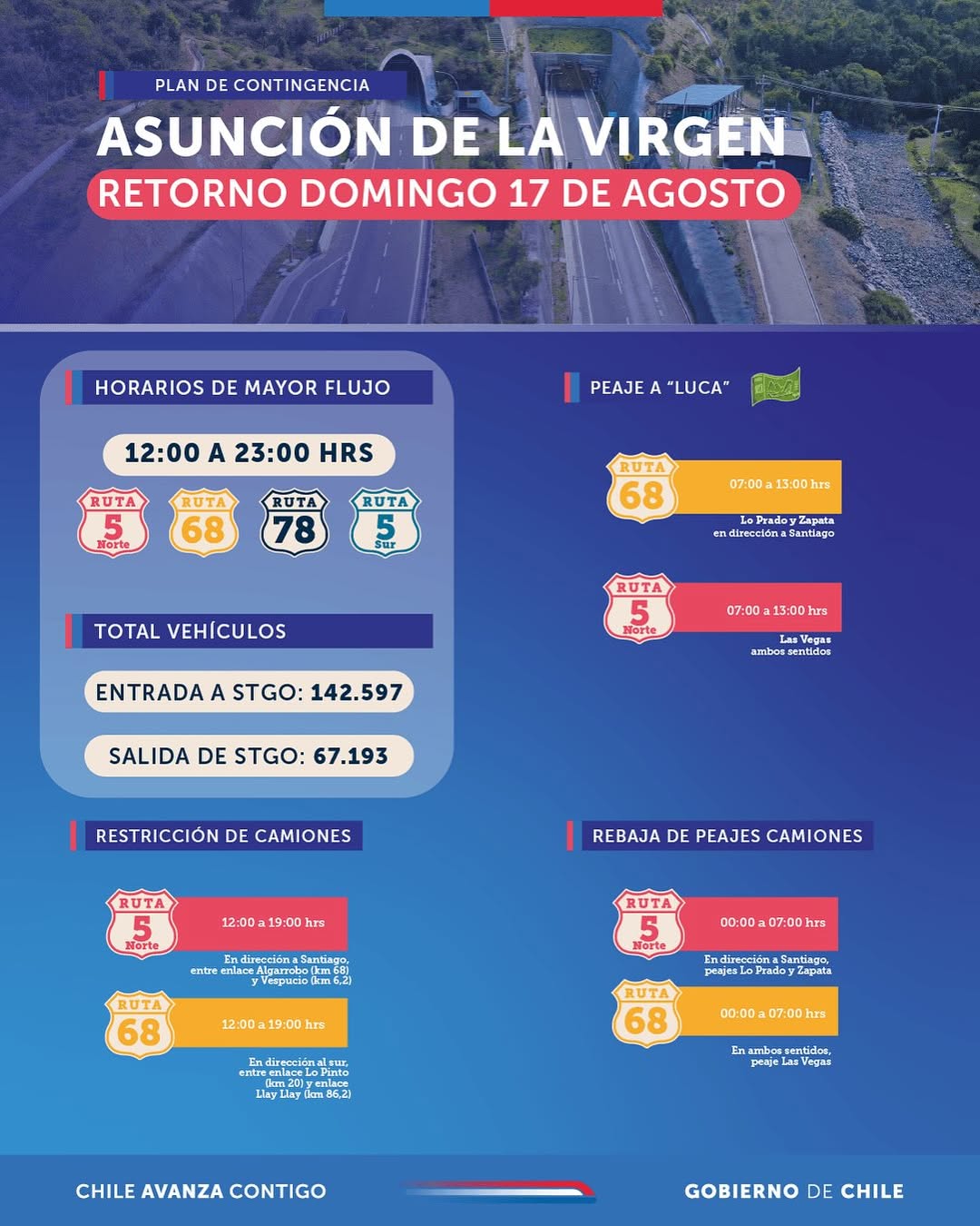- Peaje a luca entre las 07:00 y 13:00 horas, en los peajes de Lo Prado y Zapata, en la Ruta 68, y en Las Vegas en la Ruta 5 Norte.