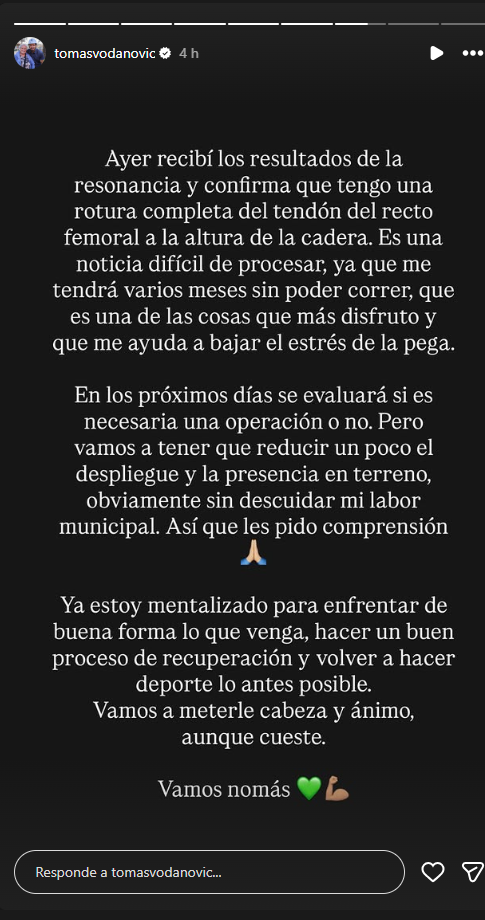 La noticia fue dada a conocer por el mismo alcalde a través de su cuenta de Instagram: "Ayer recibí los resultados de la resonancia y confirman que tengo una rotura completa del tendón del recto femoral a la altura de la cadera".