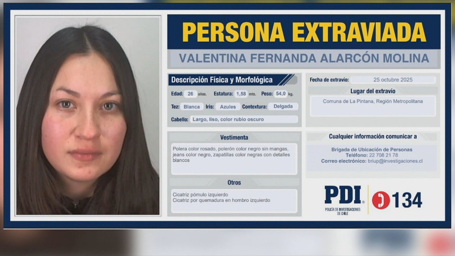 Valentina Alarcón tenía 26 años, quería estudiar Trabajo Social en marzo, por eso renunció a su trabajo como reponedora nocturna del retail. Era una fiel hincha de la Universidad de Chile, lo que se convirtió en un dato clave porque antes de desaparecer dijo que iba a una junta con barristas en La Pintana..