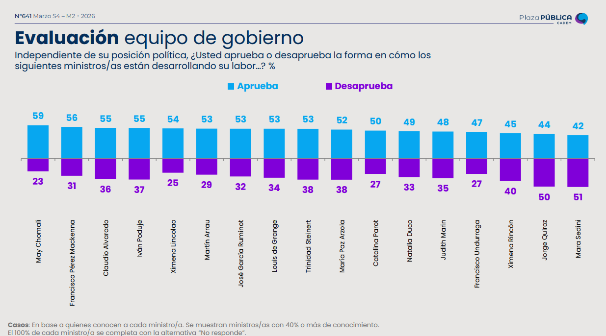 De acuerdo con el sondeo, la ministra peor evaluada es la vocera de Gobierno, Mara Sedini, con un 51% de desaprobación, seguida por el ministro de Hacienda, Jorge Quiroz, con un 50%.