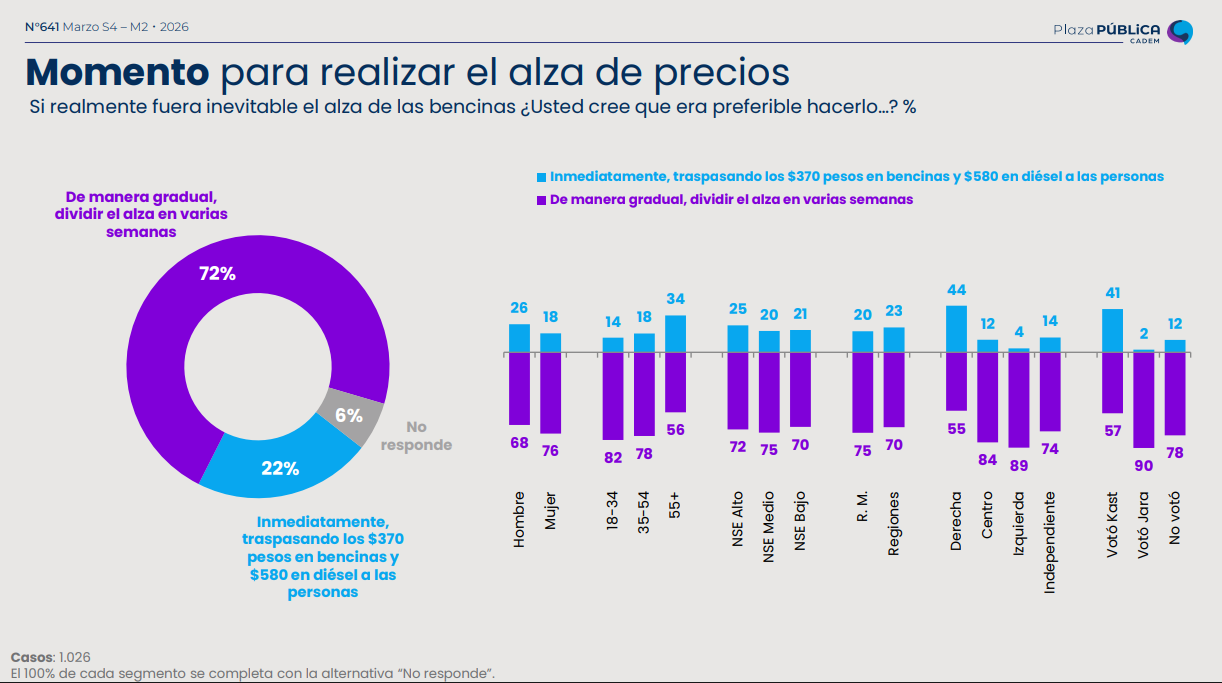 Además, un 72% dijo que el alza era preferible hacerla de manera gradual y dividirla en varias semanas.