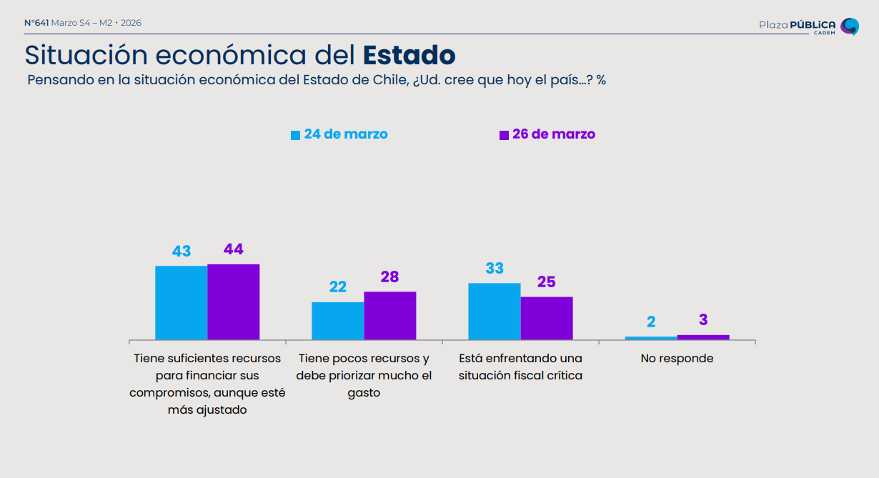 Por otro lado, en cuanto a la situación económica del Estado, un 44% cree que existen "suficientes recursos para financiar sus compromisos, aunque esté más ajustado", mientras que un 28% (+6) dice que hay "pocos recursos y se debe priorizar mucho el gasto".