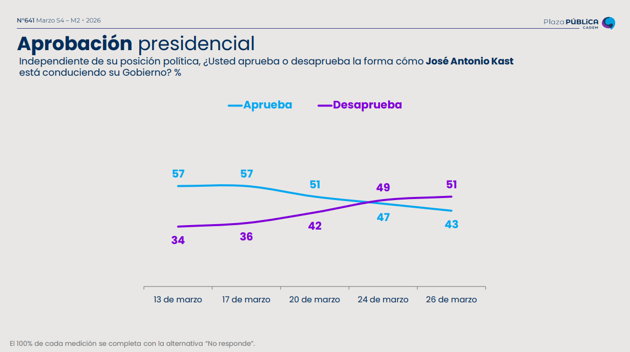 En cuanto a la evaluación a la gestión del Presidente José Antonio Kast, un 43% aprueba cómo está conduciendo su Gobierno, mientras que un 51% lo desaprueba.