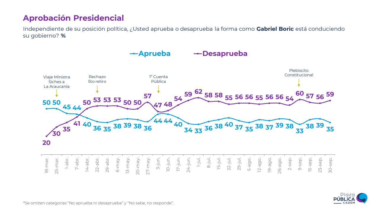 De acuerdo al sondeo, ante la consulta 'Independiente de su posición política, ¿Usted aprueba o desaprueba la forma como Gabriel Boric está conduciendo su gobierno?", un 59% desaprueba la gestión y un 35% la aprueba.