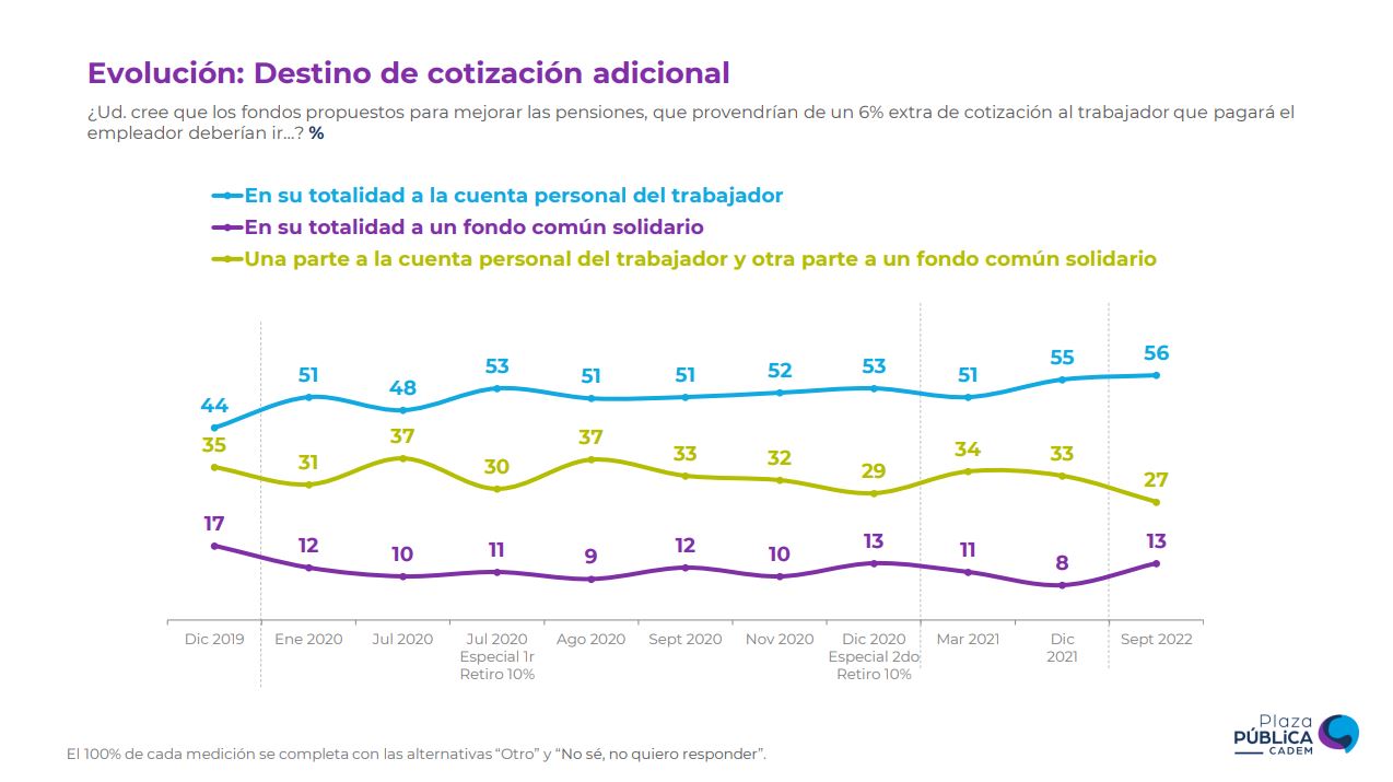Respecto de los fondos adicionales para mejorar las pensiones, un 56% de los encuestados prefiere que esos recursos vayan a la cuenta individual de los trabajadores, el 27% que se reparta entre las cuentas individuales y un fondo común, y solo el 13% que vayan en su totalidad a un fondo común solidario.