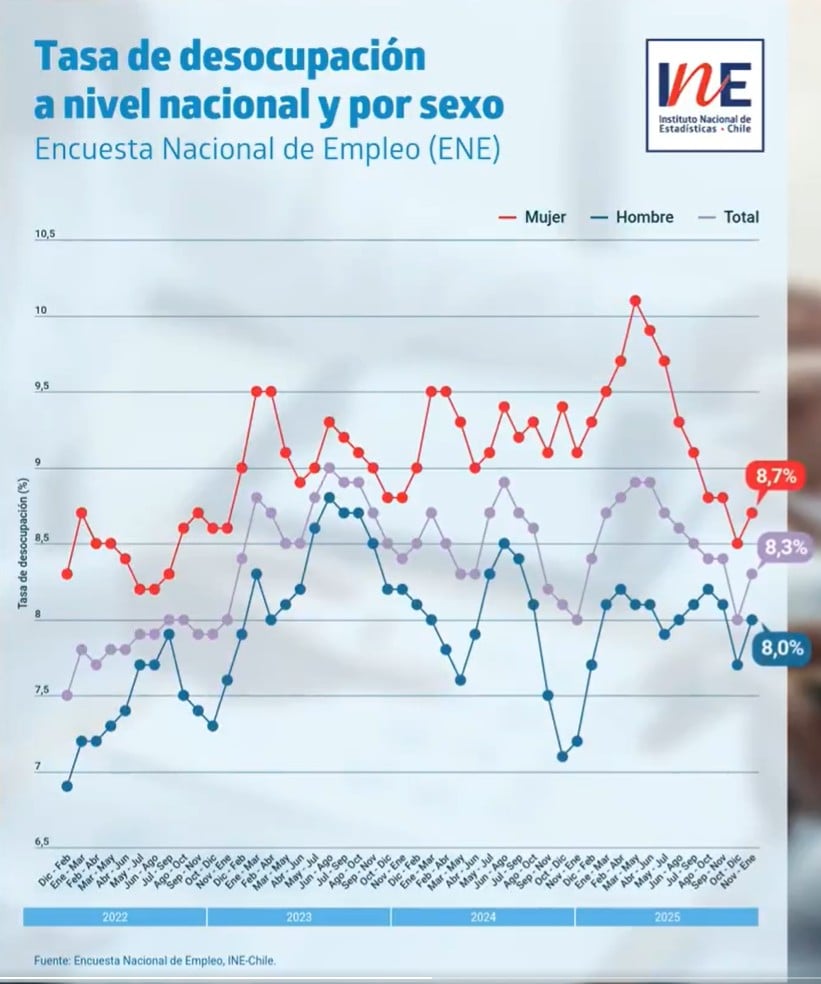 El escrito de Evelyn Matthei fue acompañado de una publicación del Instituto Nacional de Estadísticas (INE), compartida a través de la misma plataforma. En esta se da a conocer que la tasa de desocupación nacional correspondiente al trimestre comprendido entre noviembre del año pasado y enero del presente "en doce meses, registró un aumento de 0,3 puntos porcentuales (pp.)".