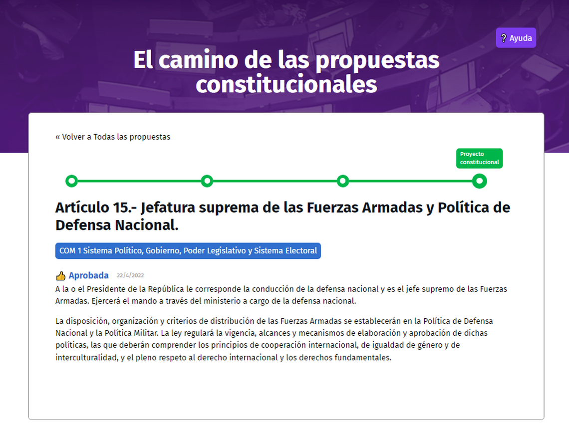 La tarde de este viernes el pleno de la Convención aprobó un artículo que afirma que la jefatura suprema de las Fuerzas Armadas y Política de Defensa Nacional esté en el Presidente de la República, pasando a formar parte del borrador de nueva Constitución.