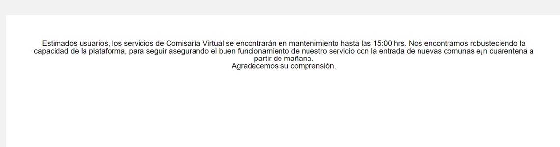 Según informó la institución, la plataforma se encontrará fuera de servicio hasta las 15 horas, momento en el que las personas podrán volver a ingresar para pedir sus permisos correspondientes. "Nos encontramos robusteciendo la capacidad de la plataforma, para seguir asegurando el buen funcionamiento de nuestro servicio con la entrada de nuevas comunas en cuarentena a partir de mañana".