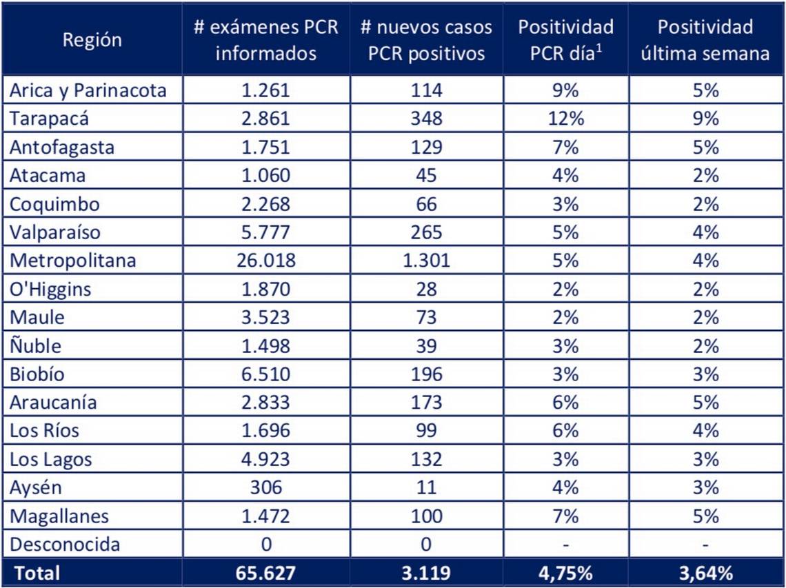 El Ministerio de Salud registró una positividad de 4,75% en las últimas 24 horas a nivel nacional, con 74.482 exámenes, PCR y test de antígeno. En tanto, se notifica una positividad del 5% en la región Metropolitana.