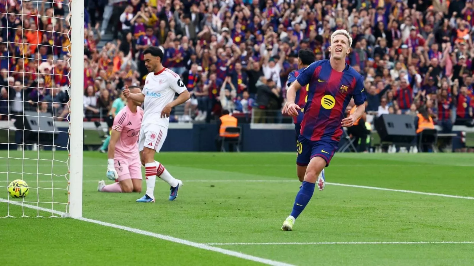 Raphinha anotó un doblete de penal (9', 21') mientras que Dani Olmo (38') aumentó la diferencia en el primer tiempo, pero el descuento de Joaquín Martínez Gauna "Oso" (45'+3') ilusionó a los visitantes con una remontada que no se consumó. El brasileño concretó su triplete (51'), João Cancelo (60') estiró la ventaja y Djibril Sow (90'+2') cerró tardíamente la cuenta.