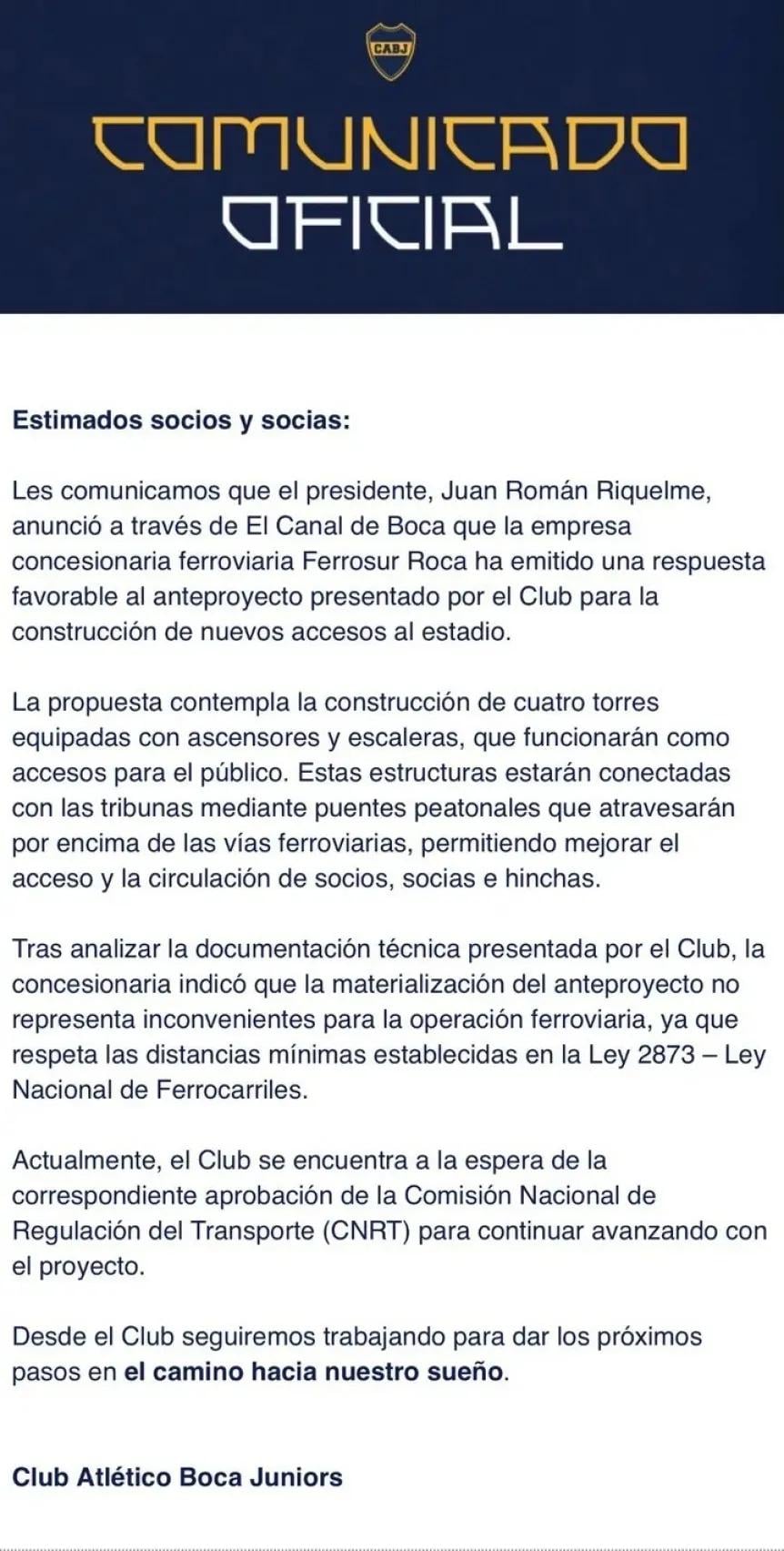 En el comunicado, Boca informó que la empresa Ferrosur Roca, encargada de regular las vías ferroviarias ubicadas detrás de la tribuna que da a la calle Irala, emitió una respuesta favorable al anteproyecto presentado por el club.