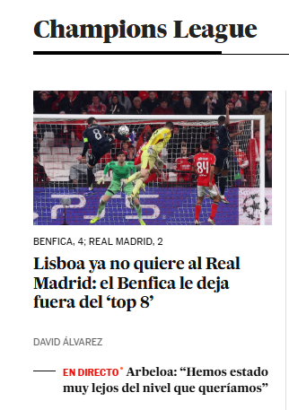 Estadio Deportivo sintetizó que "Real Madrid cayó con estrépito en Lisboa ante un Benfica feroz y se ve obligado a pasar por el incómodo play-off de la Champions tras quedar fuera del top 8" mientras que Mundo Deportivo sostuvo que la caída blanca "no fue un paso atrás, sino que un batacazo en toda regla del equipo de Arbeloa que se quedó fuera de los ocho primeros, lo que supone tener que disputar un ‘play-off’, algo que no quería". Sport, en tanto, tildó lo ocurrido de "ridículo".