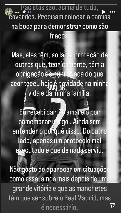 "Los racistas son, ante todo, cobardes. Necesitan ponerse la camiseta en la boca para demostrar lo débiles que son. Pero tienen, a su lado, la protección de otros que, teóricamente, tienen la obligación de castigar. Nada de lo que ocurrió hoy es novedad en mi vida ni en la de mi familia", sostuvo en Instagram.