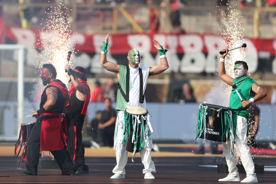 Luego apareció la Copa Libertadores junto a las siluetas de los jugadores para dar paso a una presentación de tambores de cuatro personas, dos de cada equipo.