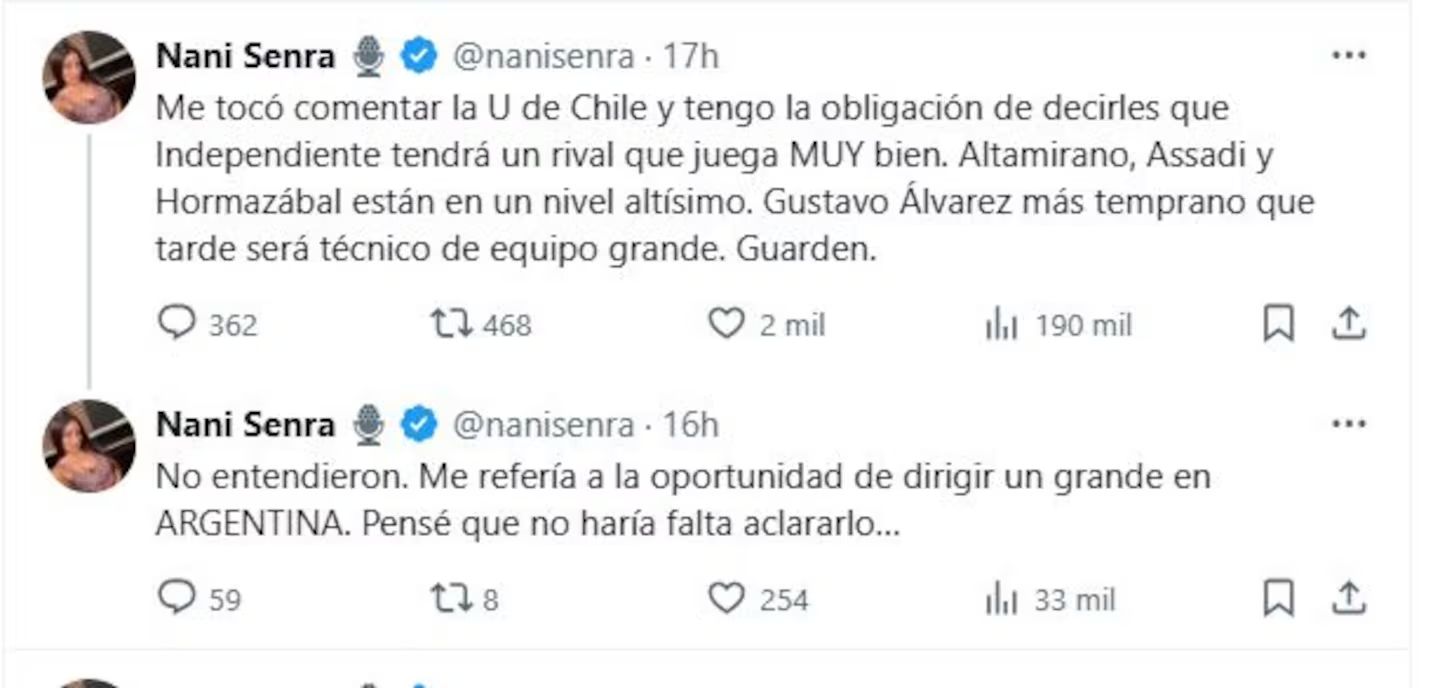 En aquella oportunidad, la reportera señaló: "Me tocó comentar la U de Chile y tengo la obligación de decirles que Independiente tendrá un rival que juega MUY bien. Altamirano, Assadi y Hormazábal están a un nivel altísimo. Gustavo Álvarez más temprano que tarde será técnico de un equipo grande. Guarden".