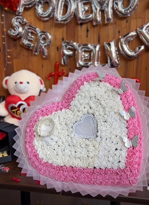"Entrega especial a Steffi Elizondo de parte de Lucas Cepeda", destacó el emprendimiento, detallando que se trata de un "ramo de 400 rosas eternas en forma de corazón".