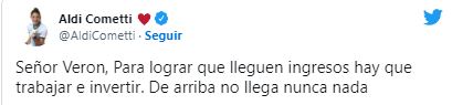 "Señor Verón, Para lograr que lleguen ingresos hay que trabajar e invertir. De arriba no llega nunca nada", escribió Aldana Cometti, defensora de la selección argentina.