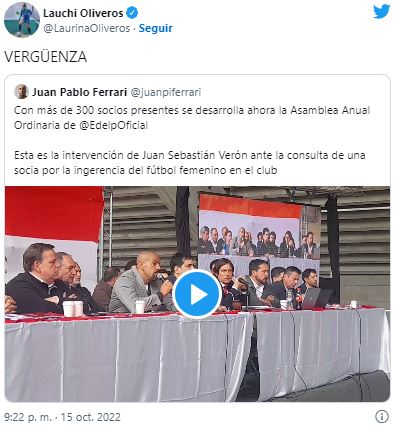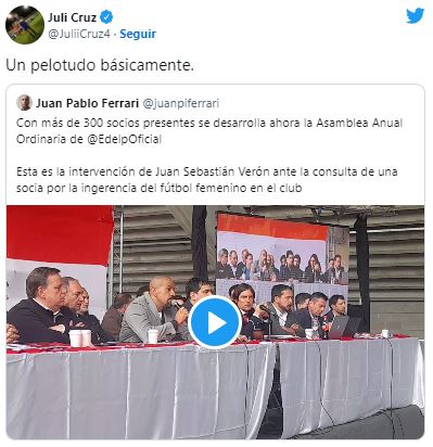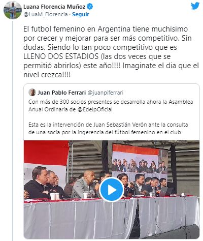 Esta es la intervención de Juan Sebastián Verón ante la consulta de una socia por la ingerencia del fútbol femenino en el club pic.twitter.com/NjDFMTkrV8