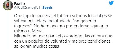 "El futbol femenino en Argentina tiene muchísimo por crecer y mejorar para ser más competitivo. Sin dudas. Siendo lo tan poco competitivo que es LLENO DOS ESTADIOS (las dos veces que se permitió abrirlos) este año!!!! Imaginate el día que el nivel crezca", apuntó Luana Florencia Muñoz, futbolista de Racing.