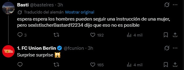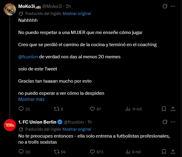 La defensa incluso se trasladó a las redes sociales, donde la cuenta de Union en X respondió a una publicación que sostenía que los jugadores no se tomarían en serio las instrucciones tácticas de una mujer: "Con todo respeto, eso es sexismo".