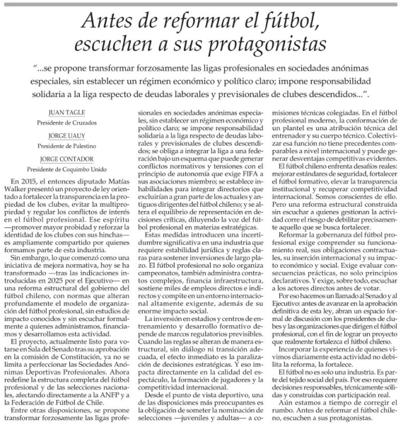 A través de una carta publicada en El Mercurio, los presidentes de Cruzados, Palestino y Coquimbo Unido —Juan Tagle, Jorge Uauy y Jorge Contador— cuestionaron duramente el proyecto, acusando que se transformó en una “reforma estructural” sin diálogo con quienes administran los clubes.