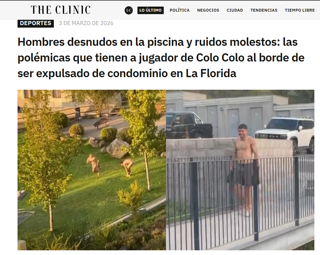 El citado medio sostuvo que las cámaras y vecinos del exclusivo sector acusaron al futbolista de invitar, durante la tarde del lunes 2 de marzo, a un grupo de amigos a la zona del jardín comunitario, espacio donde dos de las personas -aparentemente cercanos al deportista- se habrían lanzado la piscina sin ropa ante la mirada de la comunidad.
