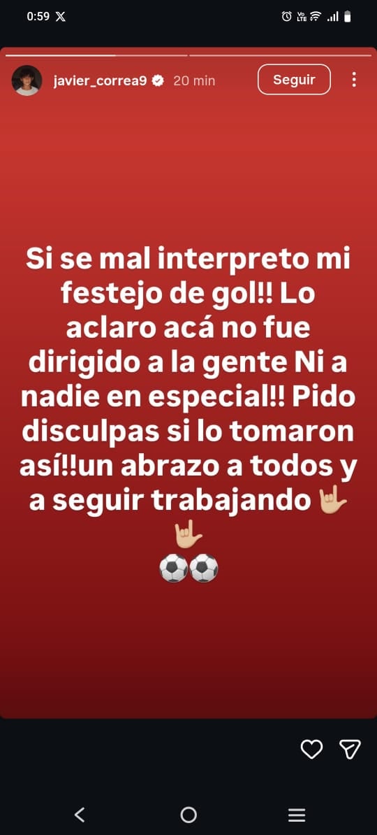 "Si se mal interpretó mi festejo de gol, lo aclaro acá que no fue dirigido a la gente ni a nadie en especial. Pido disculpas si lo tomaron así. Un abrazo a todos y a seguir trabajando", escribió.