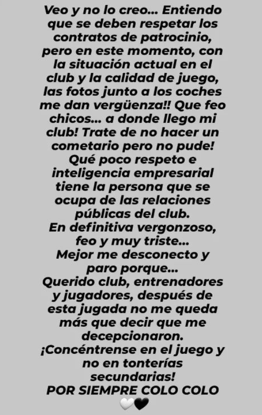 "Querido Club, jugadores y entrenadores después de esta jugada no me queda más que decir que me decepcionaron. ¡Concéntrese en el juego y no en tonterías secundarias! Por siempre Colo Colo.", subrayó.