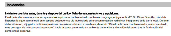 "Finalizado el encuentro y una vez que ambos equipos se habían retirado del terreno de juego, el jugador N.-17, Sr. César González, del club Deportes Iquique permaneció en el terreno de juego y se vio involucrado en una confrontación verbal con integrantes de la barra local", expresó el juez central a través de su informe.