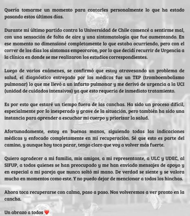 Finalmente agradece el apoyo y preocupación por parte de sus cercanos, concluyendo: "Ahora toca recuperarse con calma, paso a paso. Nos volveremos a ver pronto en la cancha".