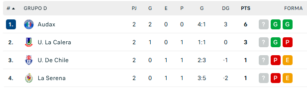 Con este resultado, Audax Italiano es el exclusivo puntero del Grupo D con seis unidades, seguido de Unión La Calera con tres. En tercer puesto se mantiene la Universidad de Chile y cierra todo Deportes La Serena, ambos cuadros con apenas un punto.