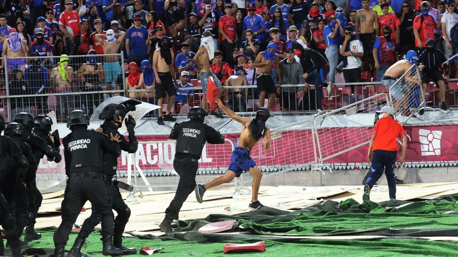 Las amenazas de 'Los de Abajo', facción radical de los barristas azules, se concretaron con la vandalización del mobiliario del recinto de Ñuñoa. Varias butacas se incendiaron y utilizaron como armas para agredir a los guardias instalados en la galería sur, hecho que se mantuvo por largos minutos.