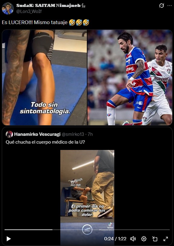 “El diagnóstico inicial fue un desgarro de semimembranoso, pero cuando lo evalué tenía una lesión del tendón el recto interno y una lesión de la aponeurosis del semimembranoso”, explicó mientras se puede observar al jugador en cuestión realizando la rehabilitación. Si bien no muestra su rostro, los hinchas rápidamente relacionaron sus tatuajes con Lucero.