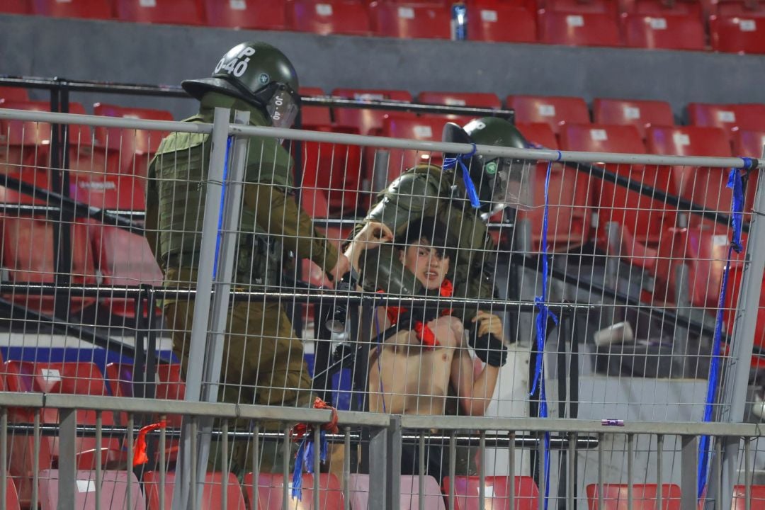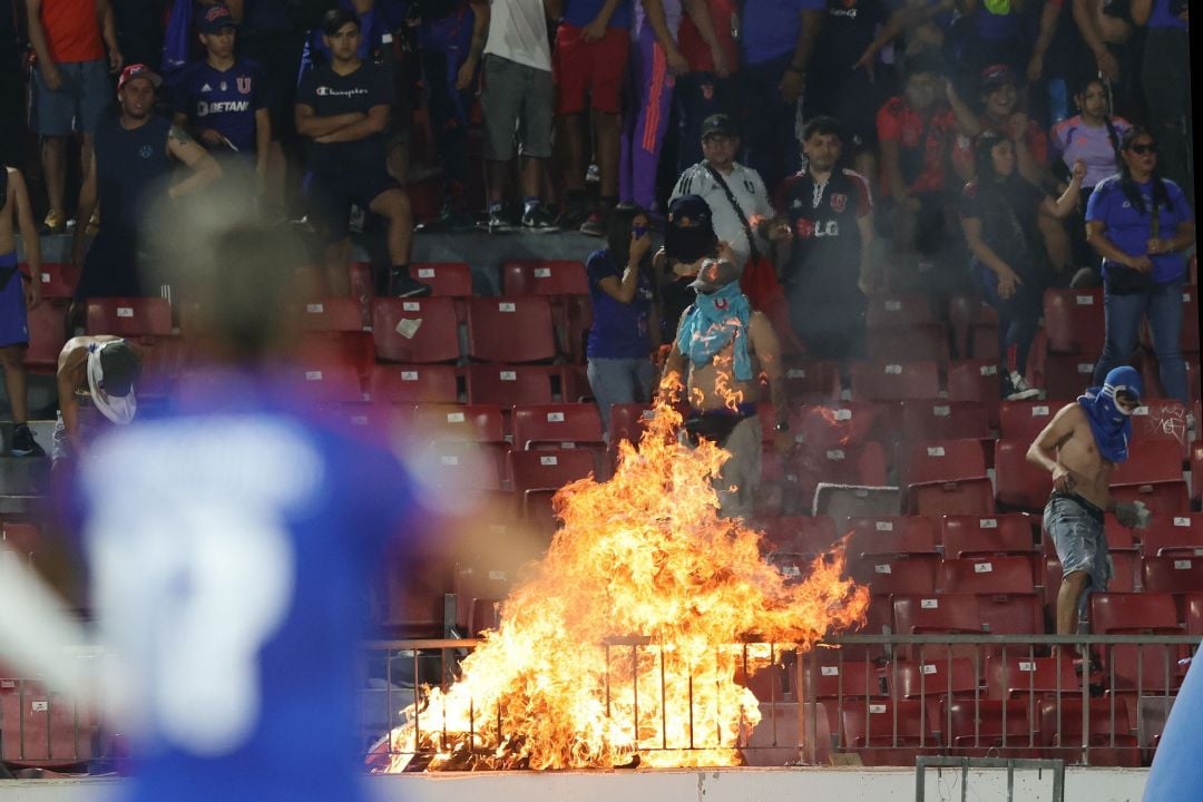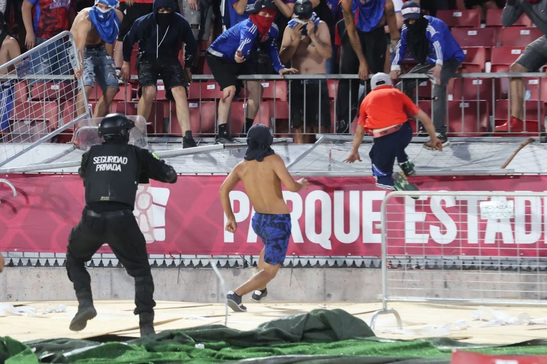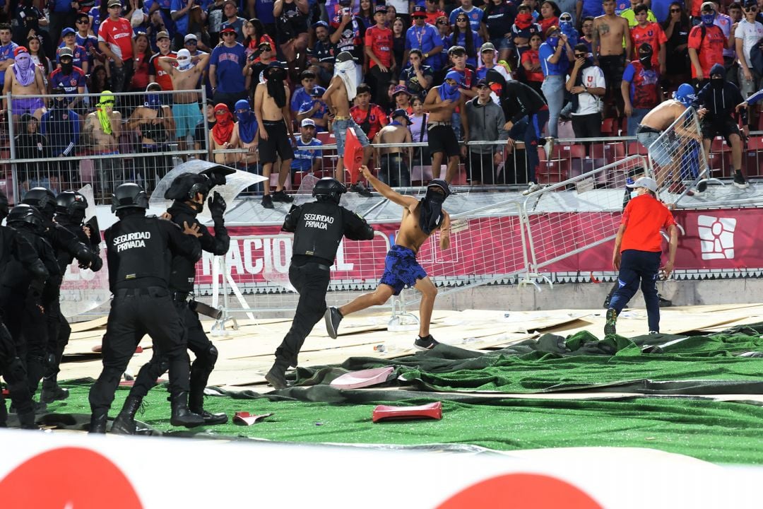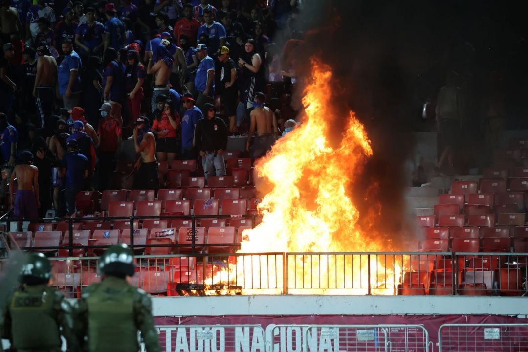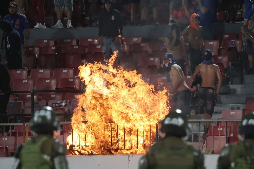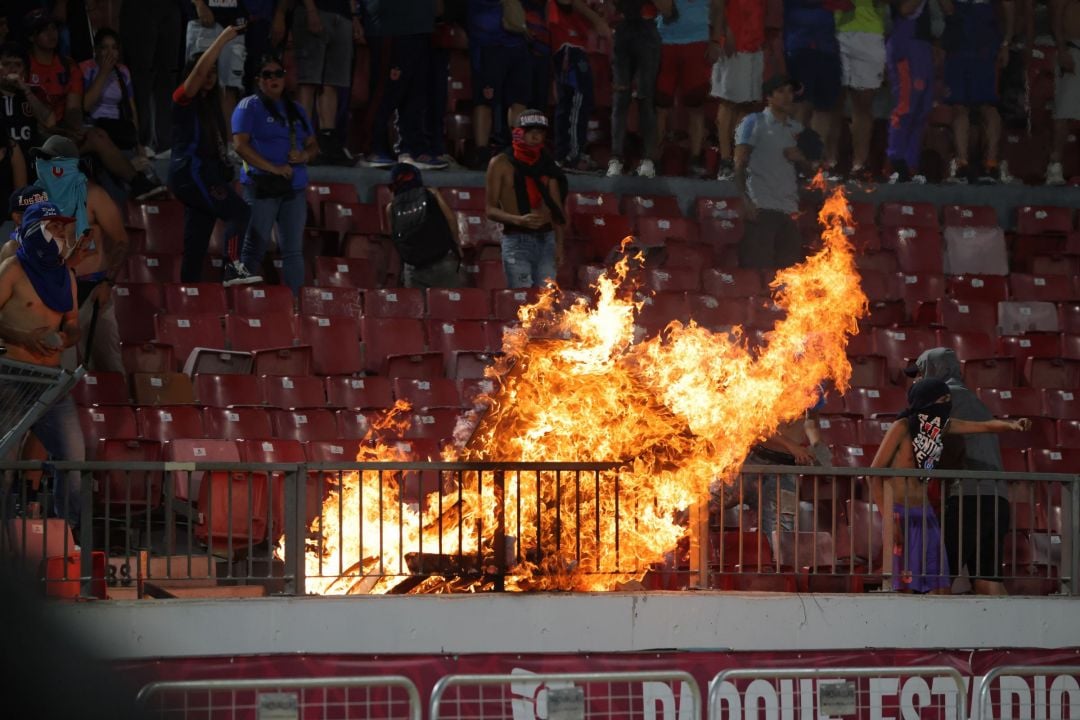 Un grupo de delincuentes que portaba la indumentaria del cuadro azul y presuntamente integrantes de 'Los de Abajo', la facción más radical de la barrabrava, destruyó e incendió butacas y vandalizó mobiliario del recinto de Ñuñoa el cual utilizó como proyectiles agredir a los guardias.