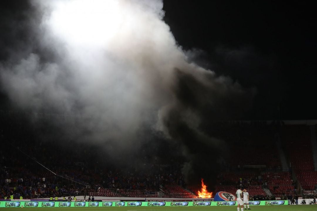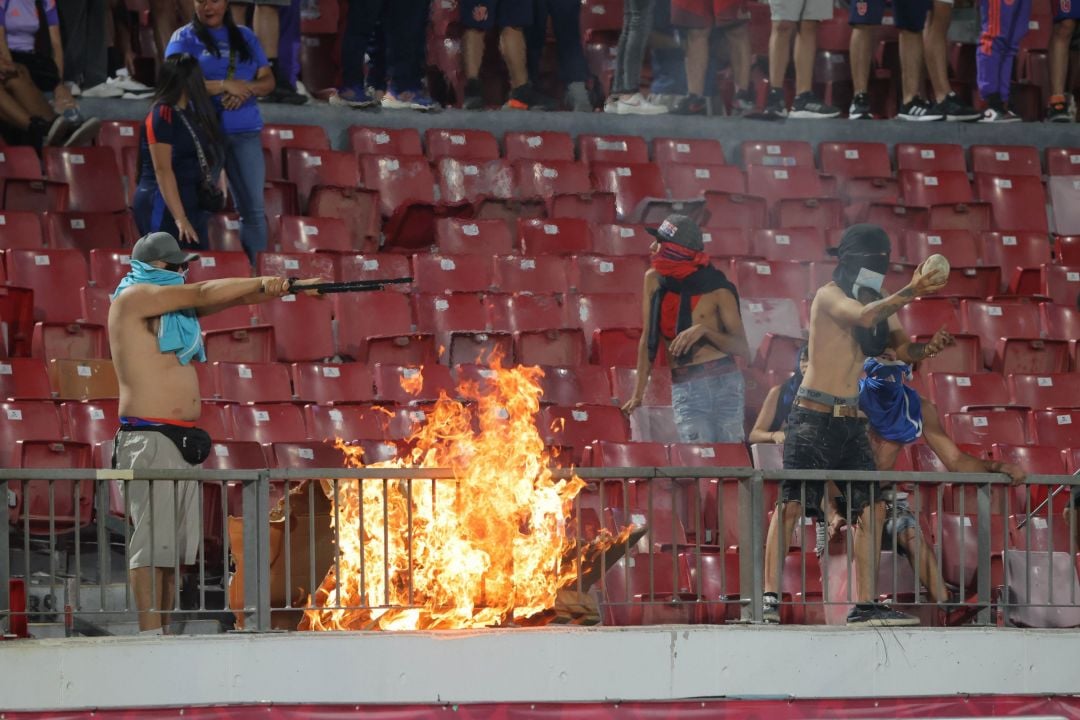El hecho más lamentable sucedió en el segundo tiempo cuando los vándalos prendieron fuego a dos basureros y los asientes situados en dicho lugar, generando una densa nube de humo que obligó a paralizar el encuentro deportivo por algunos minutos.