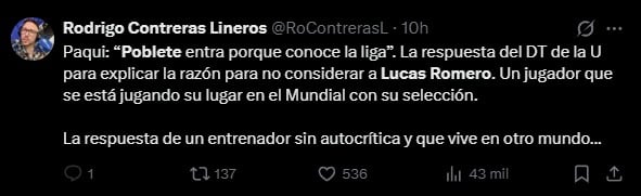 Todo ocurrió cuando el DT fue consultado por la nueva suplencia de Lucas Romero, refuerzo paraguayo que llegó esta temporada y que pese a haber sumado minutos en el primer partido del torneo no ha vuelto a ver acción, y ante Limache una vez más no lo consideró cuando decidió reemplazar a Felipe Salomoni, pues optó por el ingreso de Israel Poblete.